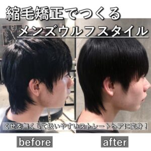 こんにちは!美容室ENORE(エノア)スタイリストのゆーたまるです!!ご予約はこちらのボタンをクリックくせ毛に悩んだ美容師がメンズ縮毛矯正に特化した結果、、メンズ縮毛矯正で見た目を変えると人生も変わる!?たくさんのメンズのお客様がご来店されて通ってくださっています、、泣嬉しいお声もたくさん頂いております!ゆーたまるがどんな風にカットしているのかを知りたい方はこちらはじめての縮毛矯正の動画はこちら縮毛矯正はどんな方におすすめの動画はこちら正しいシャンプーのやり方の動画はこちらくせがつきにくい乾かし方!の動画はこちらご予約はこちらのボタンをクリックラインからもお問い合わせやご予約お取り可能です!ご予約はこちらのボタンをクリック↓今回のブログは縮毛矯正でつくるメンズウルフスタイル特集を書いていきます!このブログでは縮毛矯正をかけてウルフスタイルにしたいメンズさんに向けてブログになっています。・縮毛矯正をかけてウルフスタイルはできるのか・ウルフスタイルにするためにはどんな縮毛矯正をすればいいのかについての疑問を解決できるブログになっていきます!では早速本題に入っていきたいと思います!ご予約はこちらのボタンをクリック☟LINEで予約Webで予約縮毛矯正でメンズウルフスタイルはつくれるの??結論から言いますと全然できます!!!! View this post on Instagram View this post on Instagram 縮毛矯正をかけるからと言って何かができないということは特にありません!髪質が地毛の直毛かのような仕上がりにできるのでカットやスタイリング次第でどうにでもできます!むしろ縮毛矯正をかけたことによってくせの影響がなくなるので以前よりも髪が扱いやすくなったり毎日アイロンすることが無くなったりします!ウルフは襟足が結構重要になってくるので襟足はくせが強く出やすいので縮毛矯正をかけてくせをリセットすることをお勧めします!メンズウルフスタイルをつくるにはどんな縮毛矯正をすればいいの??メンズウルフスタイルを作るためには縮毛矯正のかけ方もとても重要です!ただ縮毛矯正をかければいいということではありません。より自然なストレートヘアのウルフを作るためには「弱酸性縮毛矯正」でかけることをオススメします◎弱酸性縮毛矯正は肌や髪の毛がより健康でいられる優しい性質のお薬を使っていくことで従来の縮毛矯正よりも柔らかく自然な仕上がりにすることができるのでより地毛の直毛かのような仕上がります!弱酸性縮毛矯正のメリットデメリット一般的に普及しているアルカリ性縮毛矯正と比較した「弱酸性縮毛矯正」の7つのメリット!従来のペタッとしたりピンピンになったりなどのデメリットを改善した縮毛矯正になっております!かけたらメリットの方が多いのも特徴で縮毛矯正が初めての方には尚更オススメです◎襟足のうねりや膨らむ悩みも縮毛矯正で改善!ウルフスタイルにしたいから髪の毛を伸ばすにあたり多くのメンズさんがぶつかる壁の一つに襟足のくせが出てきてまとまらないというお悩みがあります。襟足は生えくせやうねりなどにより広がったりハネたりすることが多くなかなか綺麗に伸ばすことができなかったりします。そんな悩みにも縮毛矯正は大活躍をします!縮毛矯正をかけることにより襟足のくせを伸ばして綺麗にストレートにしてまとまりやすく綺麗に髪の毛を伸ばすことが可能です!後頭部の絶壁でぺったんこなシルエットにお悩みの方にはマッシュウルフがおすすめ!日本人は後頭部が凹んでいて絶壁ぎみなシルエットの方が多くそのお悩みも多いです!僕自身も絶壁なので横から見たときの後頭部のシルエットがペタッとして見えてしまい好きではありません。同じお悩みの方にオススメなのがマッシュウルフです!マッシュスタイルとウルフスタイルをミックスしたスタイルでマッシュの丸さや重さを残しつつ襟足は残してウルフシルエットを作ることで後頭部の丸みを残してウルフを作ることができるのでマッシュウルフで絶壁を補正することが可能です!ぼんのくぼあたりを短くしてくびれさせることで横から見たときのシルエットがぺたんこにならずむしろ頭の形を綺麗に作ることができます!襟足も首に沿わせるウルフな感じを生かすことで首も長く見えシルエットにメリハリを作ることができます!メンズ縮毛矯正でつくるメンズウルフスタイル特集ではここから縮毛矯正でつくるメンズウルフスタイルをビフォーアフターを交えてご紹介していきます!・メンズ縮毛矯正でつくるメンズセンターパートウルフ30代メンズさんの初来店。こちらのメンズさんは他店でツイストスパイラルをかけた履歴のあるメンズさん。パーマともともとのくせ毛で広がってしまい、扱いが大変になってしまったのがお悩み。パーマ履歴があっても髪の体力次第で縮毛矯正をかけることは可能です!全体的に縮毛矯正でパーマをリセットして自然なストレートヘアにチェンジ◎カットはバッサリ切って長さや重さ