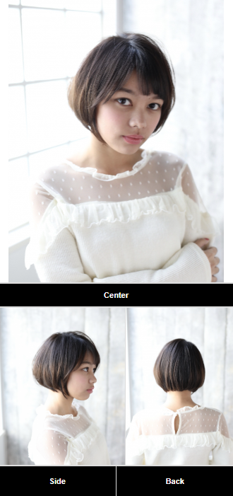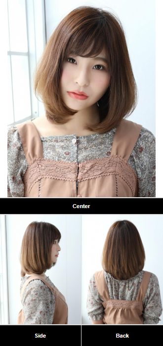 前髪長めのセンター分け、全体はきれいなひし形シルエットに仕上げた軽めボブスタイルは小顔効果抜群。