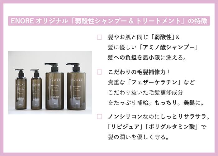 こちらのシャンプーはアミノ酸シャンプーの良さをしっかりとお客様に感じて頂きたくて、エノアがこだわって作ったオリジナル商品です。