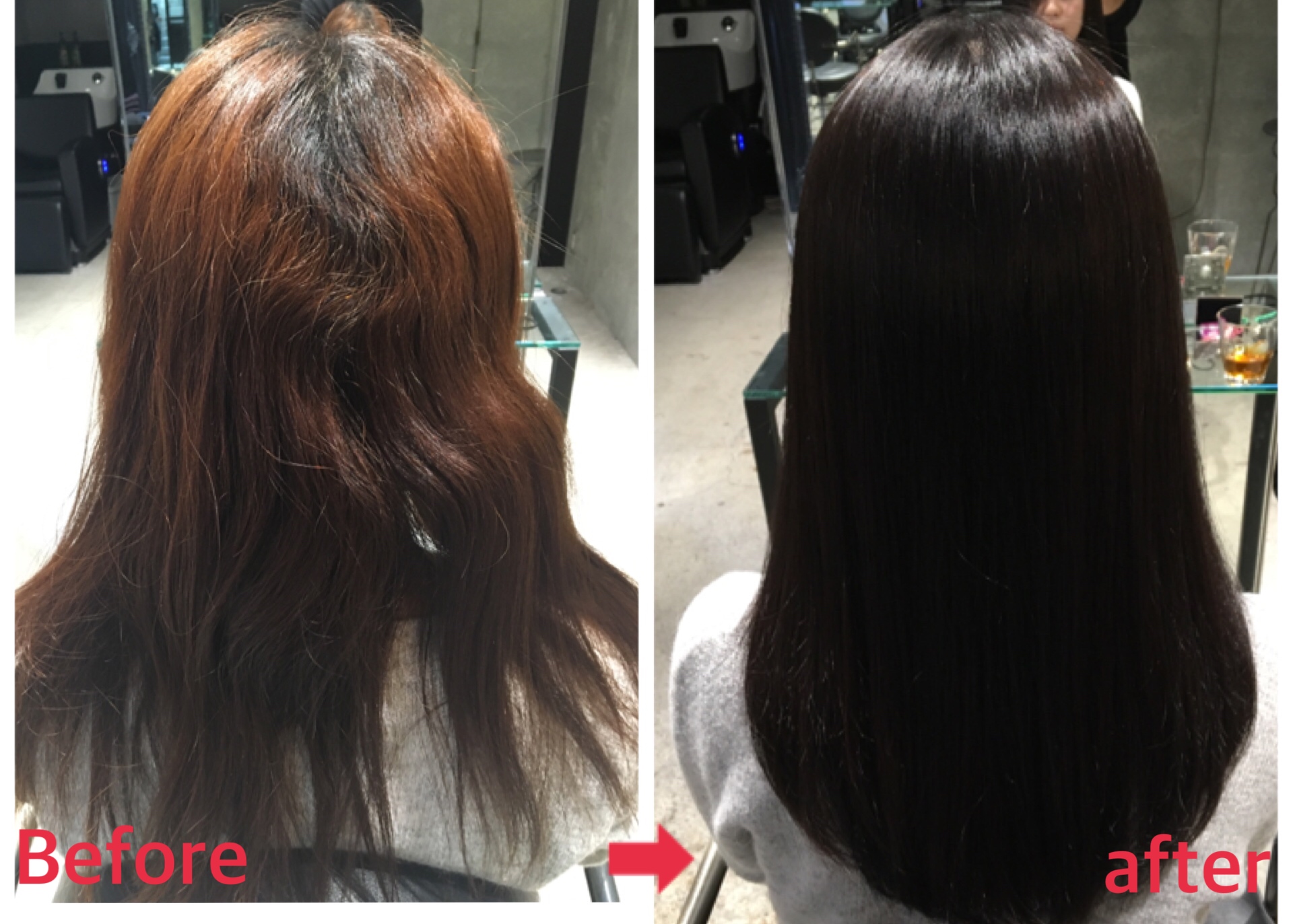 安心してください。同時に施術をした場合の工程は縮毛矯正を先にやり、その後にカラーをしていきますので赤みがでたり、明るくなるということはありません。