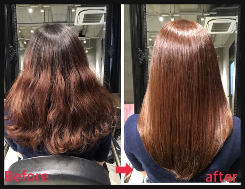 今までくせ毛で光が乱反射していましたが、縮毛矯正をかけると表面が整い光が綺麗に反射するのがツヤが出る秘密です。クセがある方だけが縮毛矯正をかけるイメージがあると思いますが、雨の日や湿気がある日に髪が広がったりまとまりがない方にも実はおすすめです。
