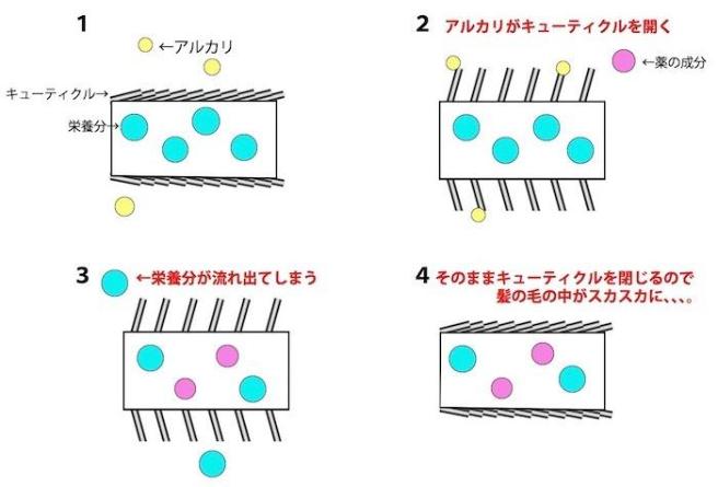 白髪染めやおしゃれ染めなどのヘアカラーは髪を染めるときに、白髪染めに含まれる「アルカリ」で髪の表面にあるキューティクルを開いて染めていきます。そのため髪を染めていると同時に実は髪の中の栄養分が開いているキューティクルから流れ出ていってしまっているんです。なので白髪染めを続けていると髪の内部がスカスカに。コルテックスダメージが蓄積されていきます。さらにキューティクル自体もダメージしてしまうので、髪が傷みやすくなり、どんどん弱々しくなってしまうんです。