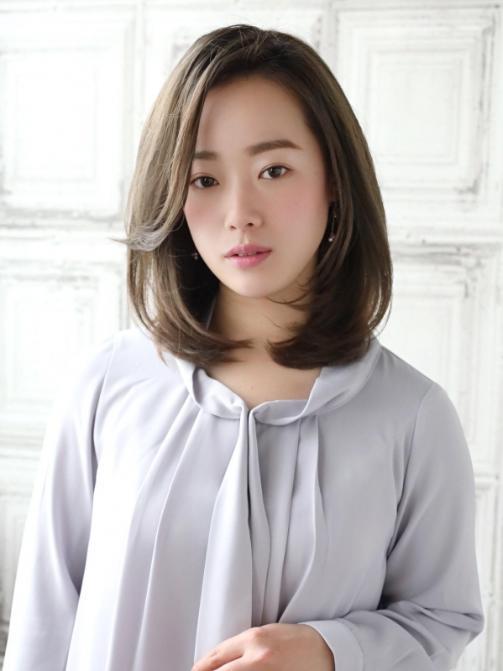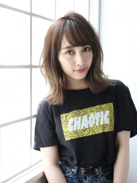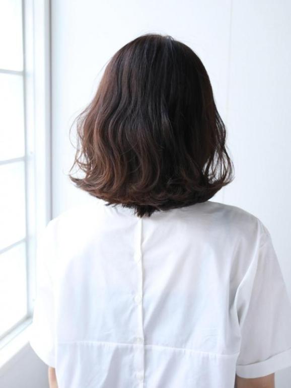 自然な内巻きのミディアムヘアは、ストレートアイロンを使った初歩的スタイル。