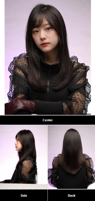 毛先重め・黒髪・内巻き・シースルーバングなど、韓国風の要素をたっぷり詰め込んだナチュラルストレートセミロングです。