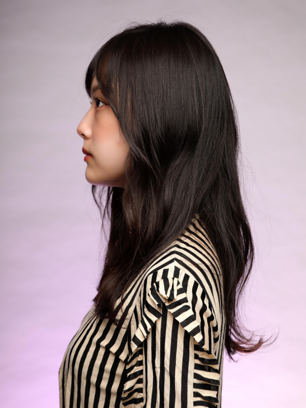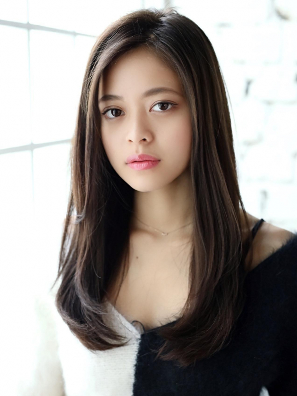 艶やかな黒髪ストレートにシースルーバングが清楚で可憐なセミロング。