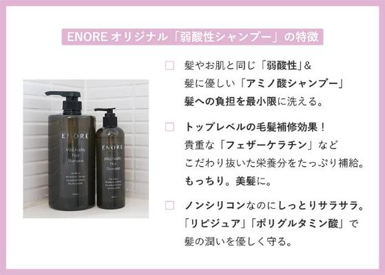 髪質改善施術が得意なエノアだから出来た 髪の調子を整えるシャンプーが「エノア弱酸性シャンプー」です。シャンプーを選ぶ時、使用感だけを基準に選んでしまう方が多いですが、シャンプーは髪の状態を大きく左右します。