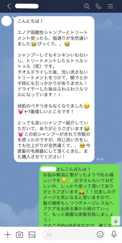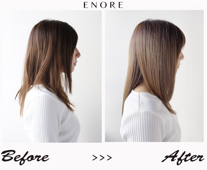 髪のダメージを最小限に抑えられる「エノア弱酸性シャンプー」は美容院で髪質改善をしている髪にもぴったりです。エノア弱酸性シャンプーを使い続けていく事で、美容院に行かない日も黄色の髪質改善メニューを施した部分を痛めない様に出来るだけ綺麗を維持していきます。そうすると美容院での髪質改善もスムーズに進み使い続けていくうちに