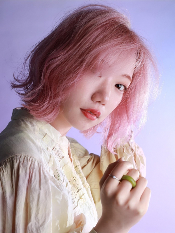 華やかピンクは20代に◎外ハネショートボブで面長カバー!
