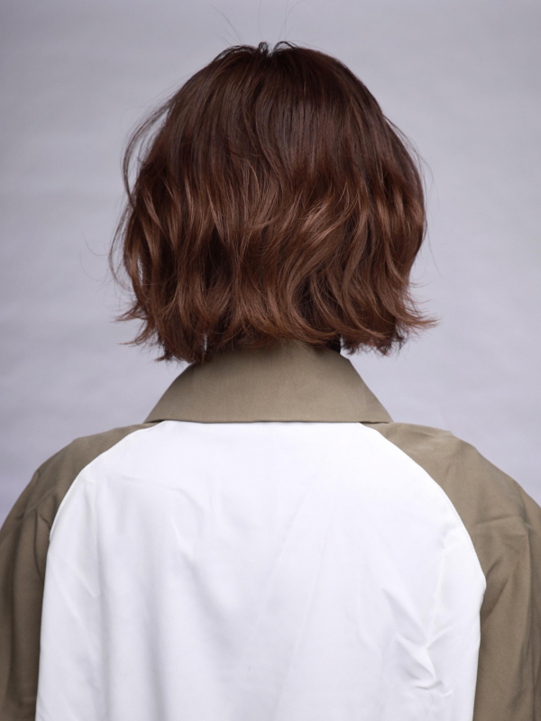 顔周りをふんわりとさせた、くせ毛風外ハネ×ショートボブは、面長さんに似合います。