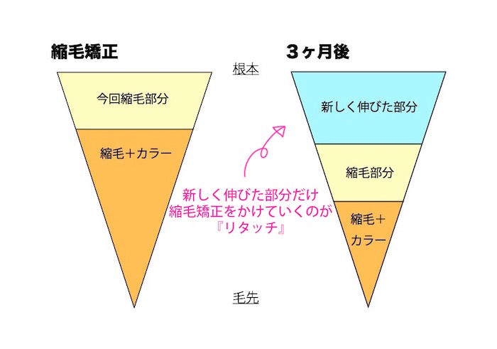 リタッチとは、髪の毛のクセが伸びてきた根元の部分だけを縮毛矯正していく技術の事です。初めての縮毛矯正の場合は髪の毛全体にかけていくと思いますが、2回目以降はリタッチを使って新しく生えてきたクセの部分だけ縮毛矯正してあげると、髪の毛に与えるダメージが最小限に抑える事が出来ます!また、縮毛矯正をかけた部分は手を施さなければ本来ずっと真っ直ぐなままです。もし、