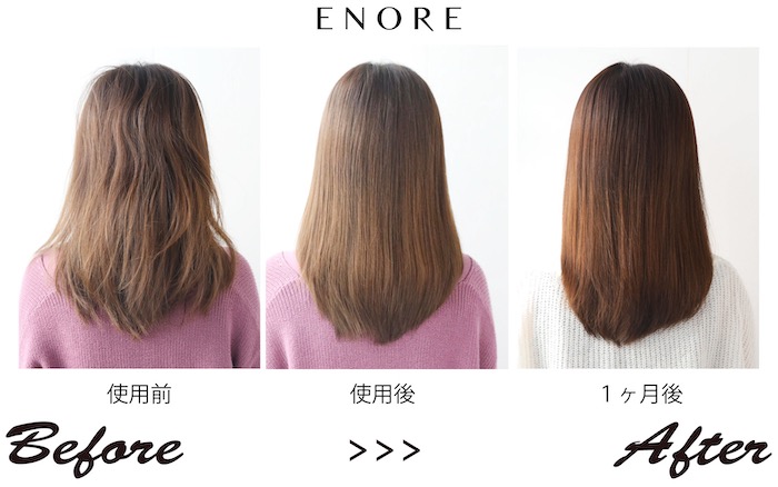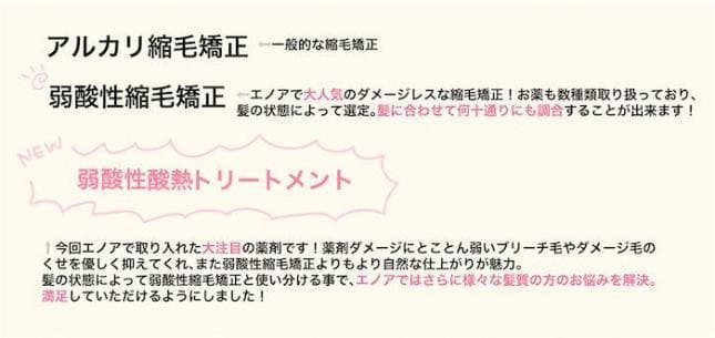 ただ、ブリーチなどで与えた髪へのダメージを無かった事には出来ません。ですが、髪の毛を綺麗に扱いやすくしてくれます!エノアではお客様の髪質を見て、今までの弱酸性縮毛矯正、そして新しい「弱酸性酸熱トリートメント」から、お客様の髪にぴったりなメニューを提案させていただきます。お客様の髪質や状態に合わせてより幅広い提案が可能になったため、今まで以上に様々な髪質の方のお悩みに対応出来るようになったんです!