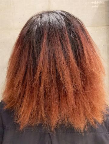・ブリーチブリーチでビビリ毛になるというより、ブリーチの大きなダメージによりブリーチ後何らかの手を髪に加えるとビビリ毛になりやすい