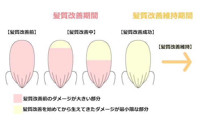 「スムーズにいけばどれくらいで根元から毛先まで髪質改善が完了するか」