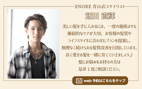 こんにちは!髪質改善が得意な美容院ENORE(エノア)青山店スタイリスト飯田です。