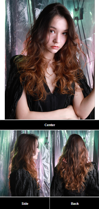 後ろ姿も巻き髪がゴージャスで、女性らしい魅力が引き立つヘアスタイルです。