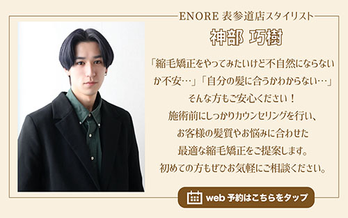 こんにちは!髪質改善と縮毛矯正が得意な美容院ENORE(エノア)表参道店スタイリスト神部です!