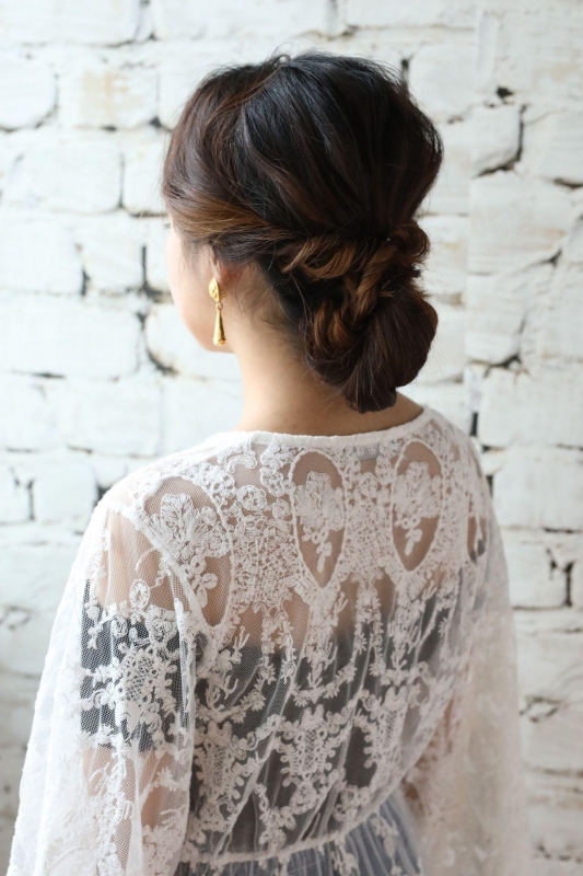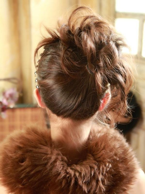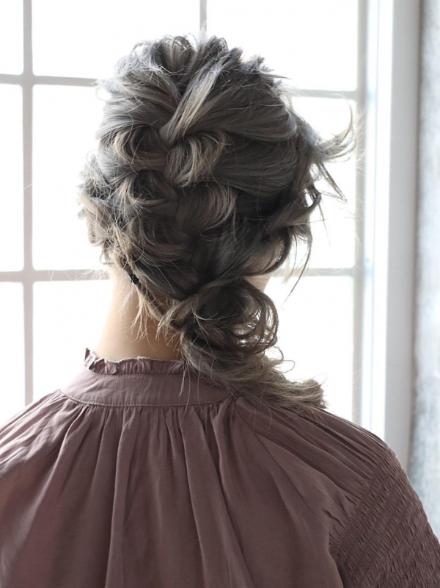 華やかな三つ編みと合わせたアップスタイル。