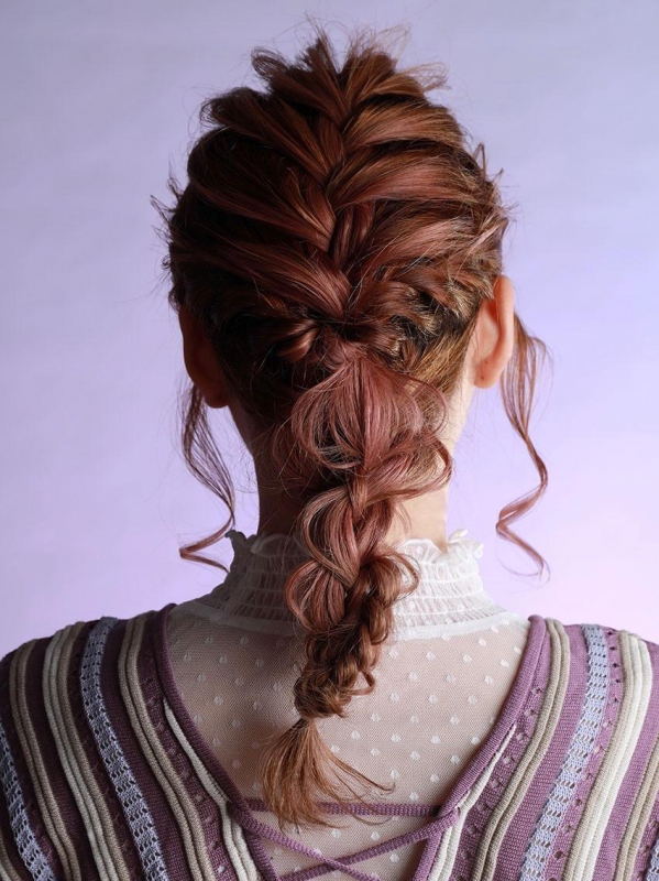 耳より下の高さで三つ編みという女性らしいヘアスタイルです。