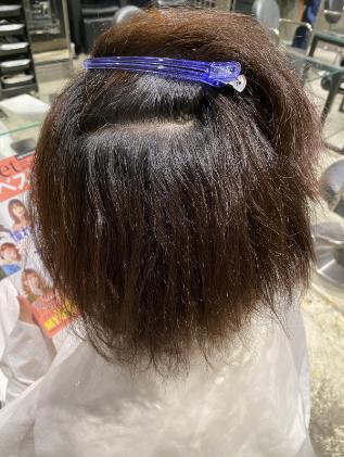今回の施術の目標としては地毛の癖を伸ばす+ビビり部分の修繕。できる限り一体感のある状態を目指し施術を行いました。