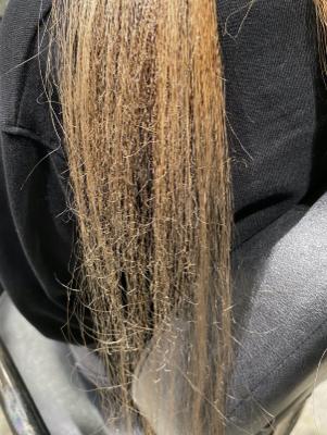 髪質は硬毛、多毛。施術履歴としては矯正毛、ブリーチ毛ですが髪にコシがありまだ体力があるのですが、毛先10cmくらいがダメージがかなり出ていてビビり②になっています。