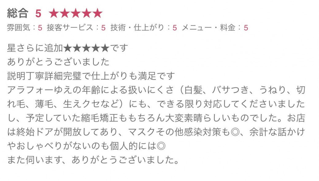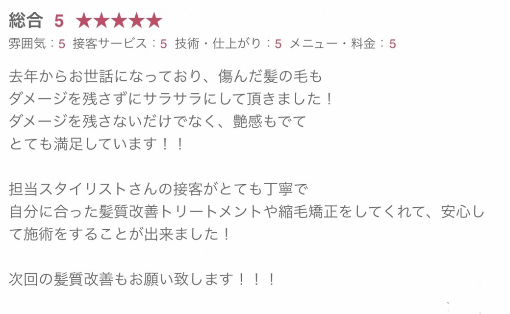 髪の状態にあった施術で綺麗になれてよかったです。