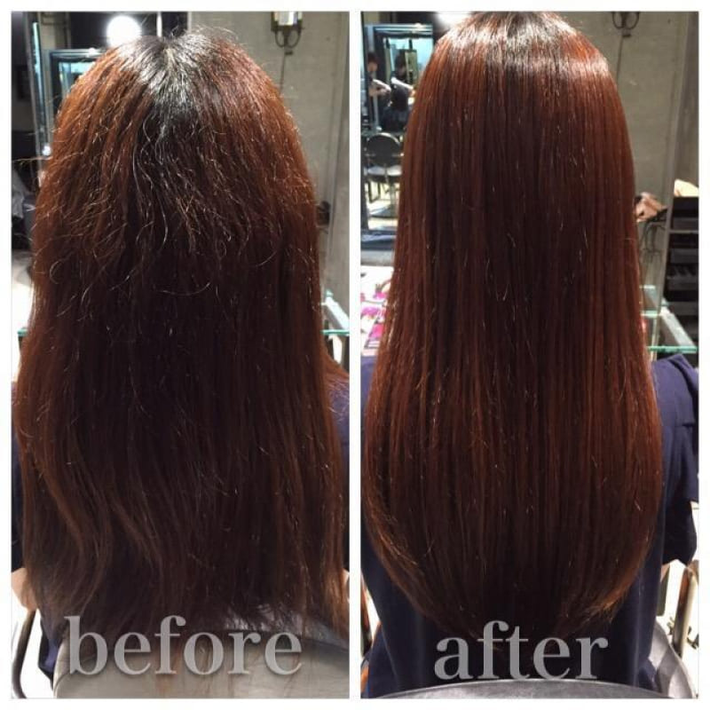 今回の施術ではトリートメントはせず縮毛矯正のみのアプローチで綺麗になり基本的にはずっと取れないツヤのある状態になっています。
