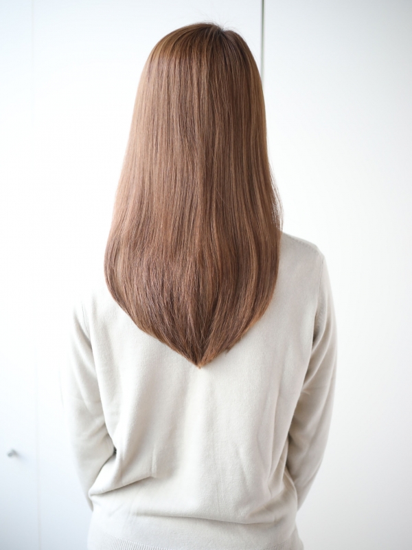 顔周りと毛先にしっかりレイヤーを入れているので、すっきり軽やかな印象のストレートロングヘア。