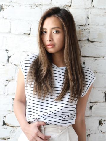 3Dハイライトとかきあげバングで、クールに仕上げたストレートロングヘア。