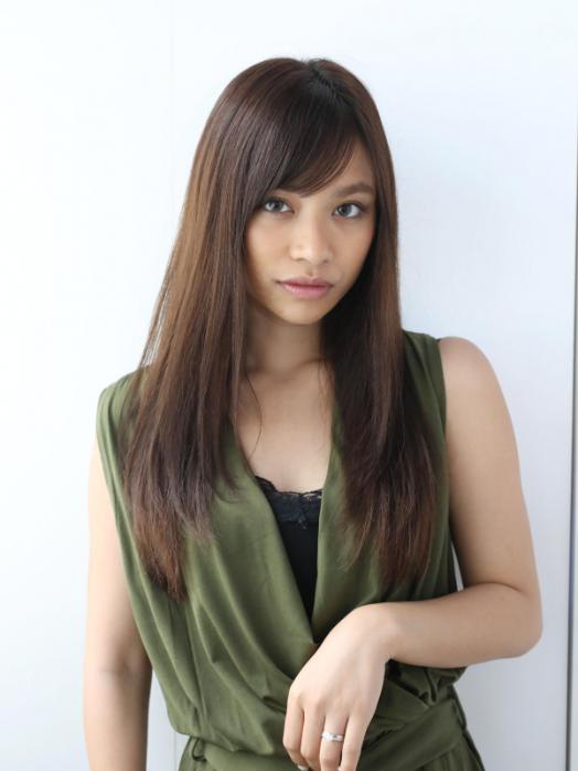 前髪ありのストレートロングヘアは、落ち着いた雰囲気のスタイルにもぴったり。