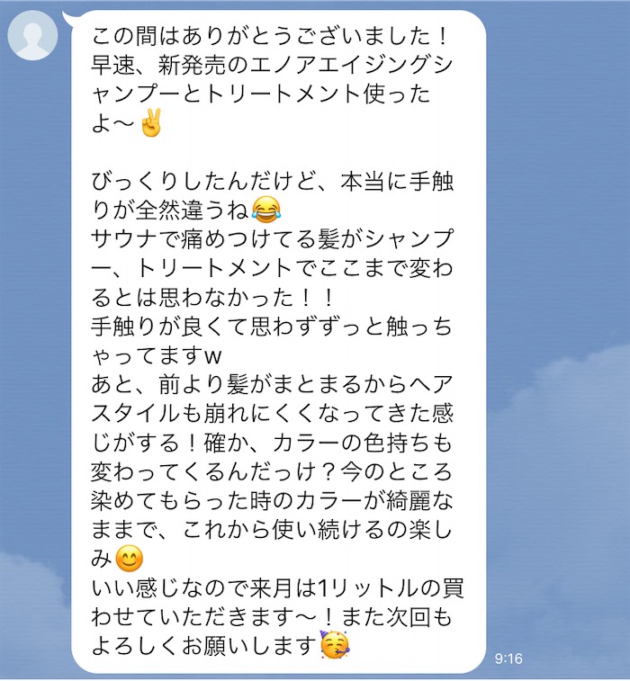 髪に合ったシャンプーを使えば髪の状態は大きく変わります。エノアでも髪に合ったエノアオリジナルシャンプーを使ったお客様の髪の状態も大きく変わりました↓