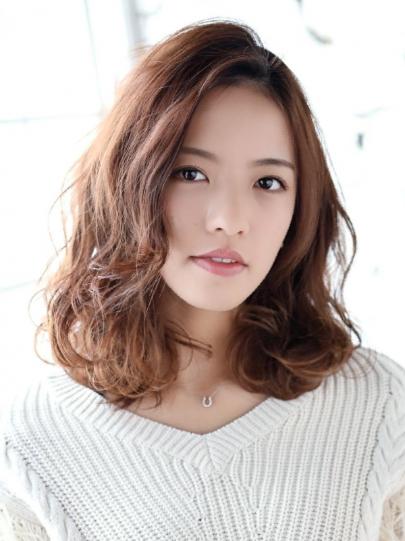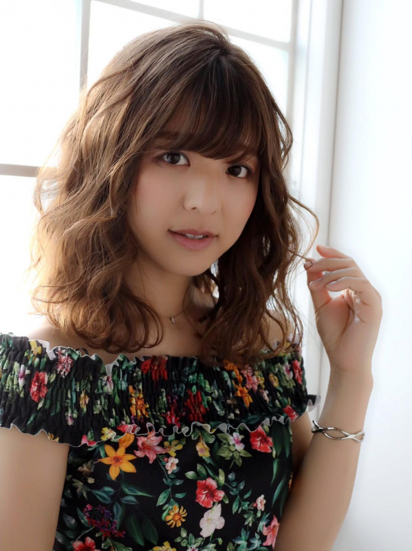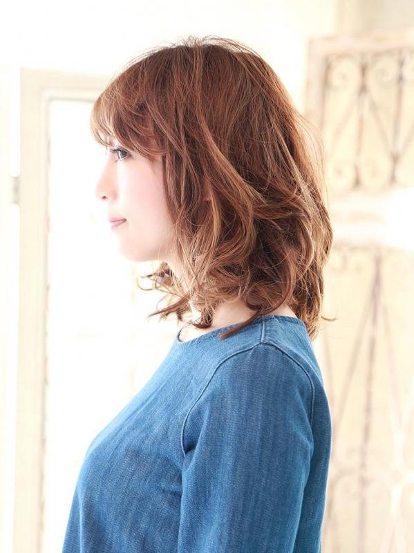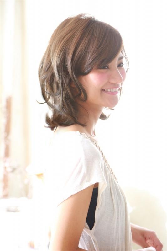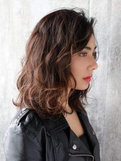 ミディアムヘアの中ほどから毛先にかけてパーマをかけ、毛先は外ハネに。