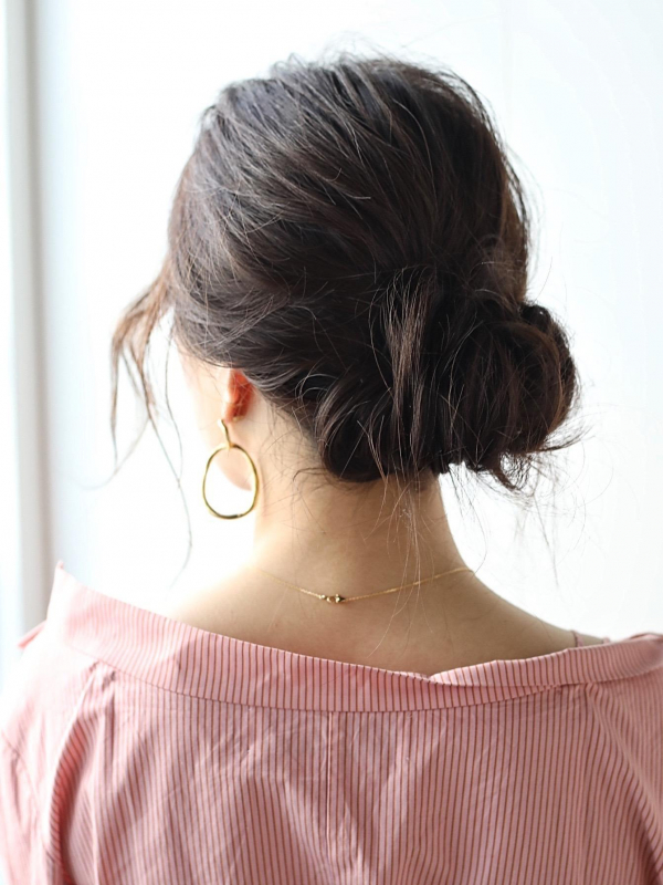 低い位置のお団子スタイルは、可愛さも落ち着きもあり、年齢問わず出来るアレンジ。