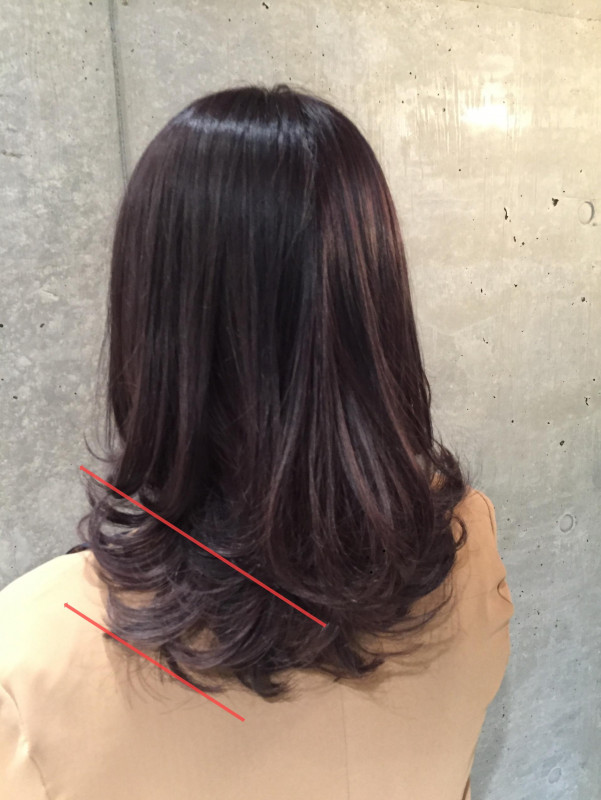 こちらの赤い線の幅が段の幅になるのですが、この幅を広げ過ぎてしまうとレイヤーの位置が無駄に高くなってしまい扱いづらくなってしまう原因になってしまいます。段の幅は広くても15cm。それ以上の幅は縮毛矯正毛とき相性の良いレイヤースタイルにはなりません。