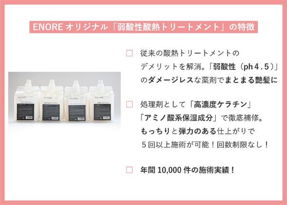 *ちなみにエノアでは酸熱トリートメントは「弱酸性酸熱トリートメント」というメニュー名になっており、「髪質改善トリートメント」とメニューになっているものはエイジングケア効果や補修効果の高いシステムトリートメントのことを言います。