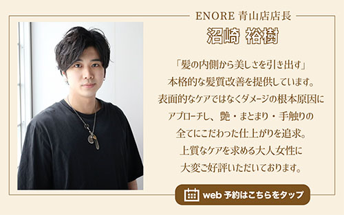 こんにちは。髪質改善が得意な美容院ENORE(エノア)青山店店長沼崎です。