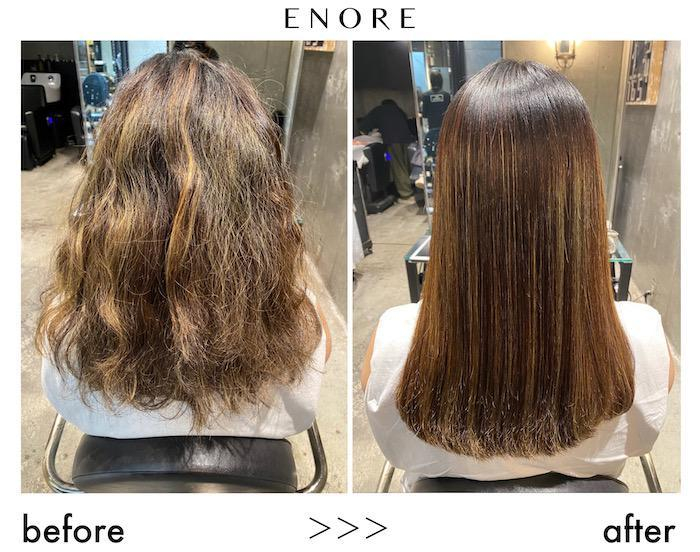 エノアでは根元:弱酸性縮毛矯正、毛先:弱酸性酸熱トリートメントの施術も可能です↓