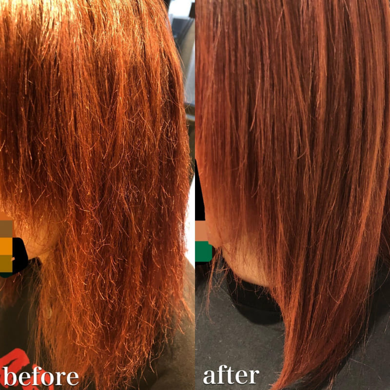 枝毛、切れ毛、くせかなり治りました。根本のくせは簡単には取れませんが毛先の保湿効果は時間と共に取れていってしまうのでハイダメージ毛に縮毛矯正を行う場合は家でのケアも重要になります。