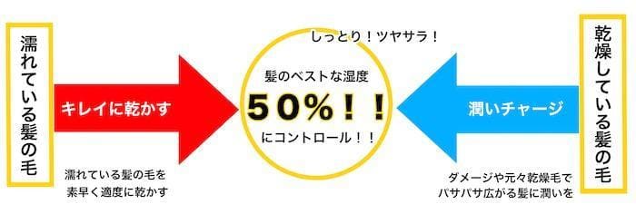 育成光線はさらに髪にとって一番ベストな湿度50%(気温25度の場合)になる様に水分コントロールしてくれます!つまり「乾燥した髪には潤いを与え」「潤い過ぎている髪は適度に乾燥させて」湿度50%にしてくれるんです。だから、濡らした髪を自分で乾かしても乾かしすぎる事はありませんし、乾いた髪に風を当てても水分コントロール質感がキレイになって効果が発揮されます!