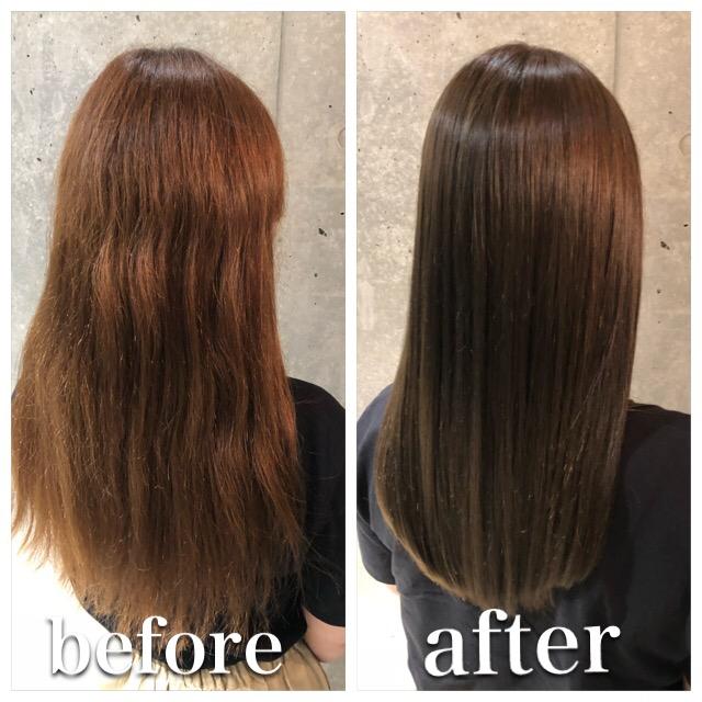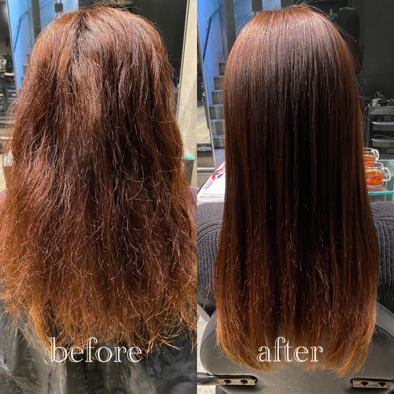 今のダメージのある状態でも可能な範囲での縮毛矯正を行い、弱酸性カラーで色を入れ髪の状態の改善を図りました。