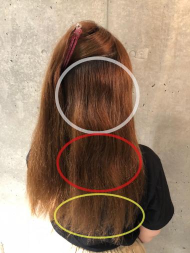 問題は赤と黄色に囲っている部分。ここは過去に矯正をかけたがうねりが戻りパサつき広がりが出ている所なので髪質本来のうねりのある癖とダメージが混ざってるので慎重に薬剤を調合し部位を分けて縮毛矯正を行っていきます。