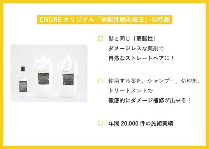 エノアオリジナル「弱酸性縮毛矯正」と「弱酸性カラー」は、長年ありとあらゆるくせ毛を伸ばしてきたエノアの毛髪診断士が、「お客様に安心してカラーと縮毛矯正をして最高のヘアスタイルを手に入れて欲しい」その一心から研究に研究を重ね開発した薬剤です。