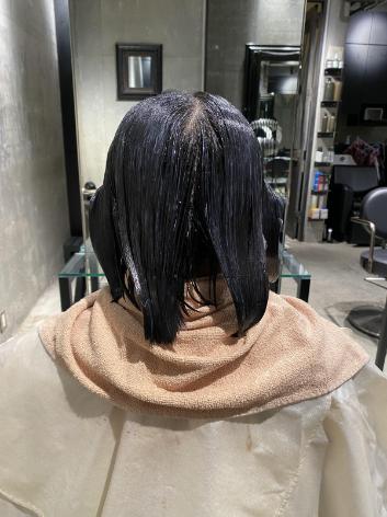 普段から過度にアイロンも使っていないとのことなので、バッサリカットし毛先まで自然になる様に縮毛矯正をかけていきます。