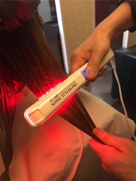 超音波アイロンを髪に通し、トリートメント成分を髪のさらに奥まで浸透させます。これにより「手触り」と「持ち」がより向上します。※超音波アイロンは電源を入れると赤いランプが点きますが、熱を発生させるわけではないのでご安心ください。