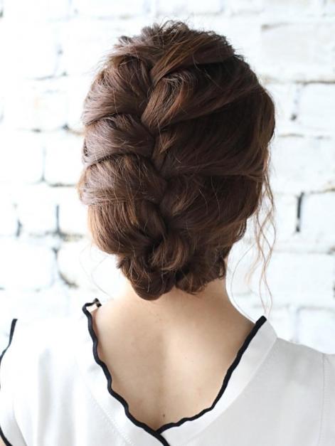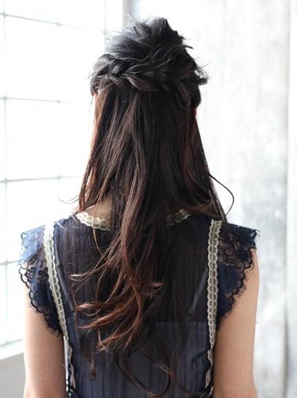 ロングヘアを上から編み込みして、襟足でひとまとめ。