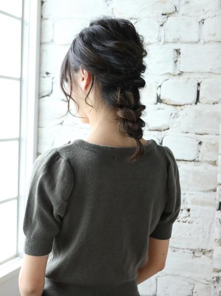 バック上段はくるりんぱ、サイドは編み込み、バック下段はツイストに。