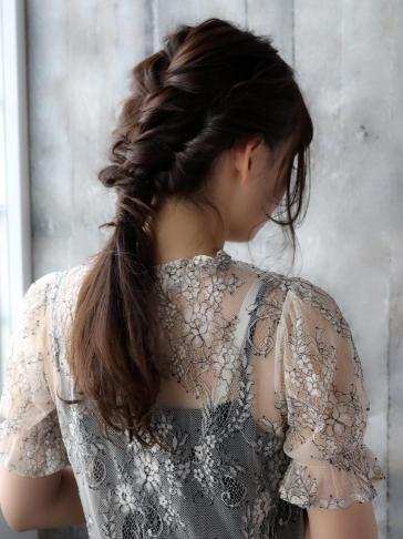 編み込んだ毛先をサイドにのぞかせ、フロントスタイルも華やかに。