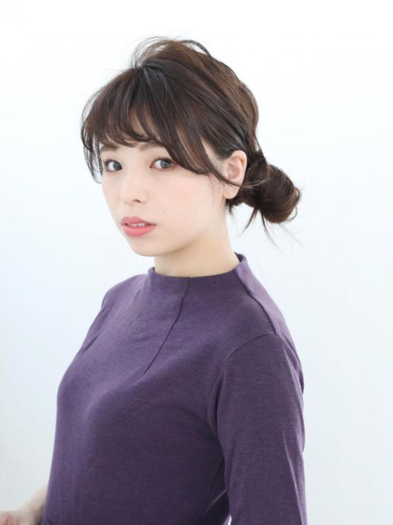 残した前髪と、低めの位置でお団子を作るのがポイントです!