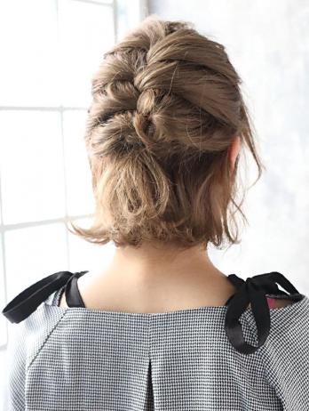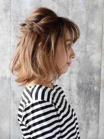 ボブヘアのハーフアップを編み込みして、少しほぐしたヘアアレンジです。