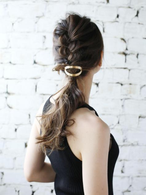ポニーテールしたら、細かく引き出して全体を崩し、毛先をまとめてピンで留めるだけ。