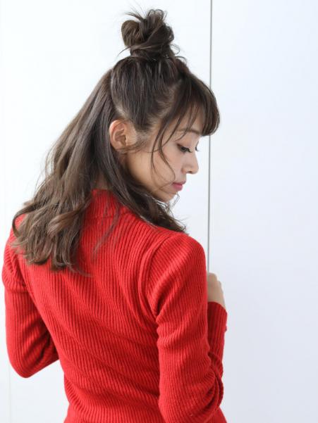前髪なし+ハーフアップ+くるりんぱの合わせ技で上品ムードのヘアアレンジ。
